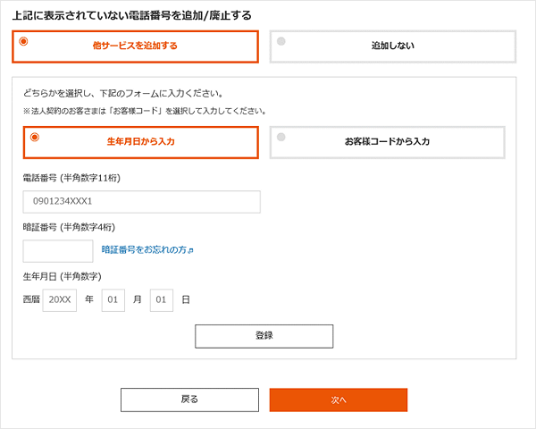 申込画面の「上記に表示されていない電話番号を追加/廃止する」という項目で、他回線を追加/削除できます。