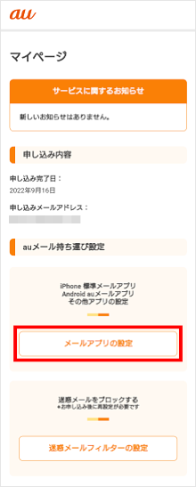 ※Androidスマートフォンの「auメールアプリ」でauメール持ち運びをご利用中の場合は、以下の手順で操作してください。
