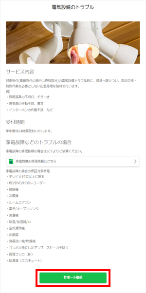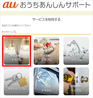 「おうちトラブル」のメニューで、[お困りごと]を選んでタップします。 ※ここでは例として、「電気設備のトラブル」を選びます。