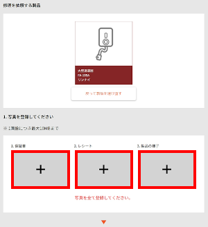 [+]をタップして、修理を依頼する製品の「メーカー保証書の写し」「購入証明書(レシートなど)の写し」「故障機器の状態を撮影した画像」の写真を添付します。