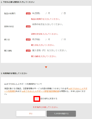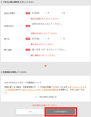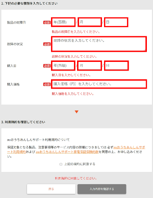 「製品の故障日」「故障の状況」「購入日」「購入価格」を入力します。