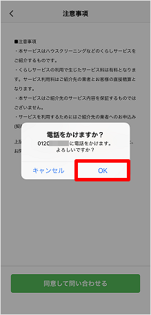 電話アプリの発信確認が表示されるため、[OK]をタップします。