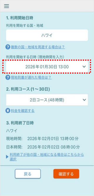 利用を開始する日時をプルダウンで選択します。