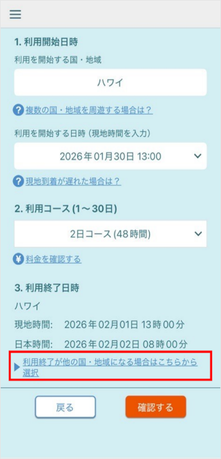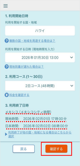 利用を終了する国・地域・時間を確認し、[確認する]をタップします。