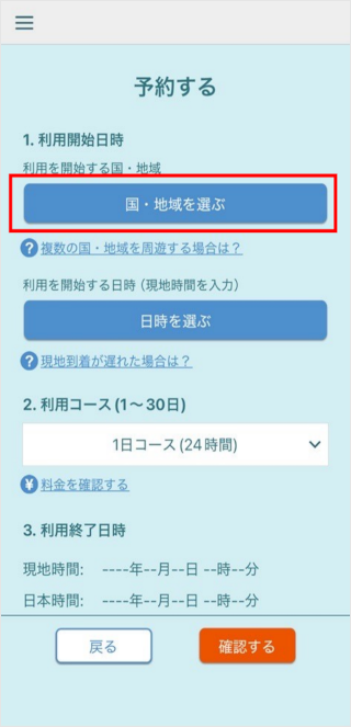 ※「予約割を利用して800円で24時間利用できる国や地域」と、「1,000円で24時間利用できる国や地域」を混在して周遊する場合、利用を開始または終了する国や地域のいずれかに、「1,000円で24時間利用できる国や地域」を登録の上、予約してください。