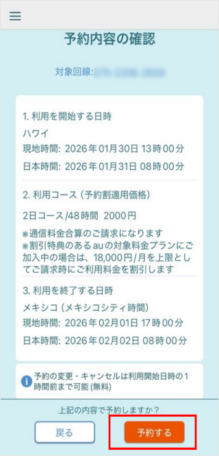 予約内容を確認し、[予約する]をタップします。