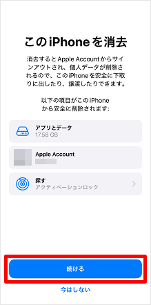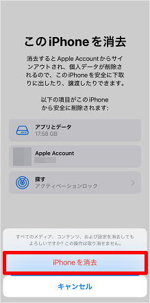 [アップロードを完了してから消去]、または[今すぐ消去]をタップします。 端末の「探す」機能がオフになっていれば、どちらかをタップするとすぐにリセットが開始します。