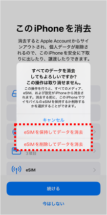 eSIMをご利用の場合は、この画面が表示されます。 初期化後も端末を利用する場合は、[eSIMを保持してデータを消去]をタップします。eSIMを削除した場合、eSIM再発行の手続きが必要になるためご注意ください。 端末の修理/交換/下取りを行う場合は、データをすべて初期化するため、[eSIMを削除してデータを消去]をタップします。eSIMを削除しない場合は、下取り・かえトクプログラムなどの端末回収ができない場合があります。