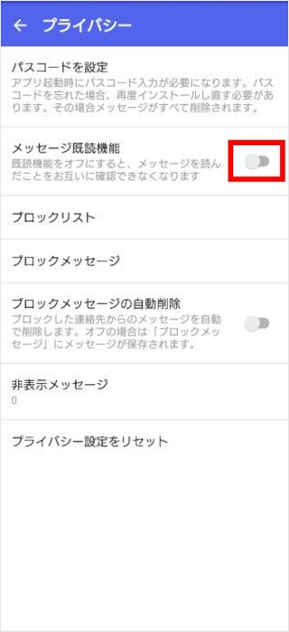 [メッセージ既読機能]のスイッチをタップし、オフにします。