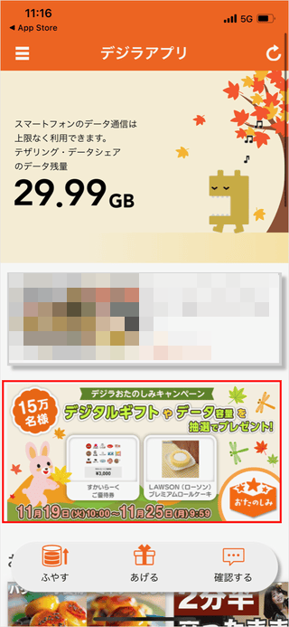 デジラアプリのトップ画面が表示されます。[デジラおたのしみキャンペーン]をタップし、キャンペーンにご参加ください。 「デジラおたのしみキャンペーン」のバナーがうまく表示されない場合は、お手数ですがデータチャージサイトでキャンペーンにご参加ください。 データチャージサイトはこちら 受け取ったデータプレゼントには、有効期限があります。有効期限内であれば、デジラアプリでお好みのタイミングでチャージができます。 データプレゼントのチャージ方法はこちら