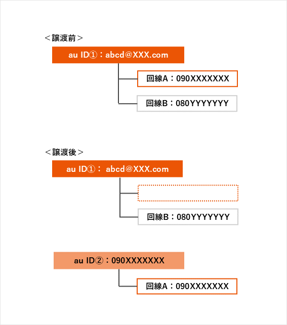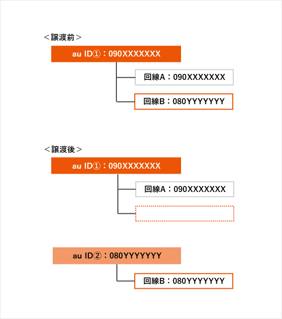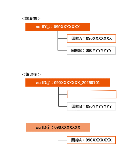 (例)au ID ①:090XXXXXXXで、「回線A:090XXXXXXX」と「回線B:080YYYYYYY」を契約していて、「回線A:090XXXXXXX」を家族間譲渡する場合(2026年1月1日に実施)
