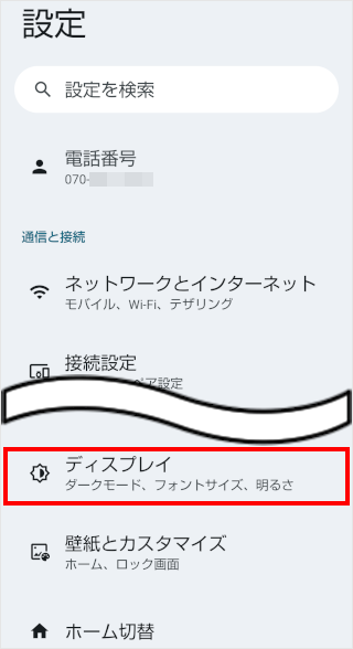 [ディスプレイ]をタップします。 ※「画面設定」と表示される機種もあります。