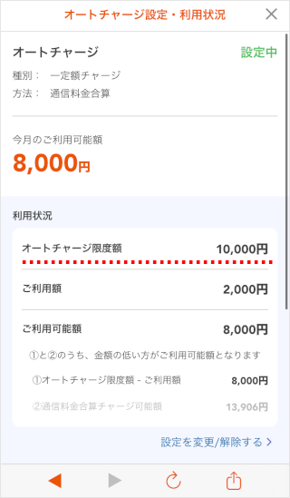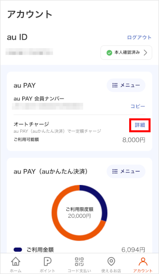 お客さまが現在設定しているオートチャージ限度額は、au PAY アプリで確認できます。