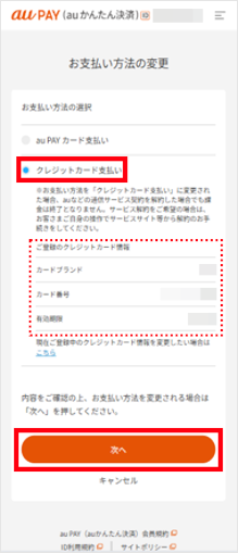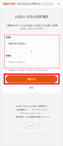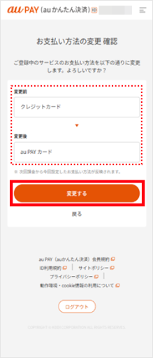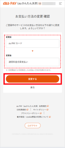 「ご登録中のサービス」ページでau PAY カード支払いに変更できます。