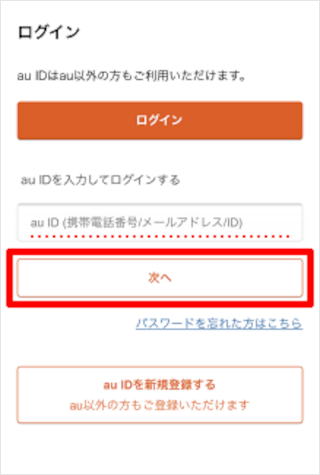お申し込みになるメールアドレスの「au ID」を入力し、[次へ]をタップします。