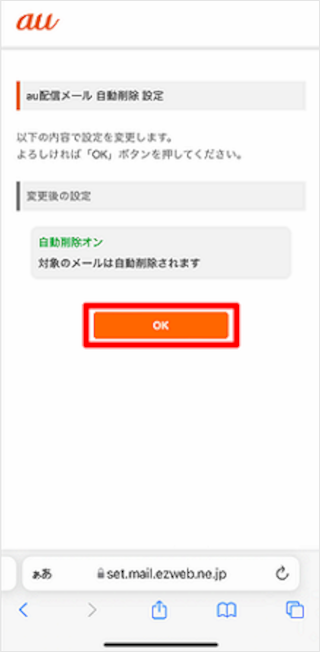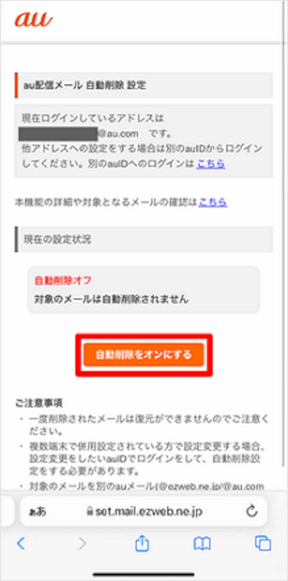 auメール持ち運びサービスで、auからのお知らせメールを自動削除するには、マイページにアクセスして設定を行います。