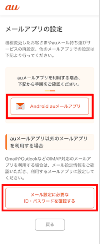 Android:[Android au メールアプリ]をタップします。 Gmail:[メール設定に必要なID・パスワードを確認する]をタップします。