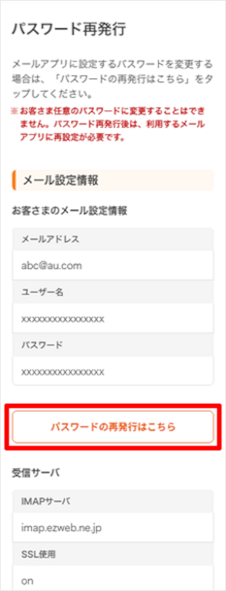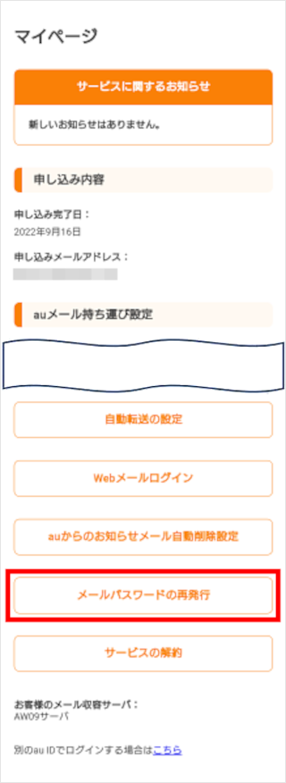 auメール持ち運びの「マイページ」にアクセスし、メールアプリ設定用のパスワードを再発行できます。 詳細については、以下をご確認ください。