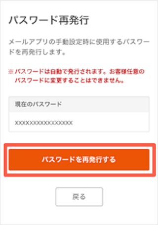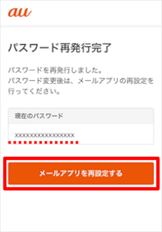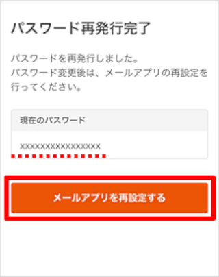 新しいパスワードが表示されました。 [メールアプリを再設定する]をタップします。
