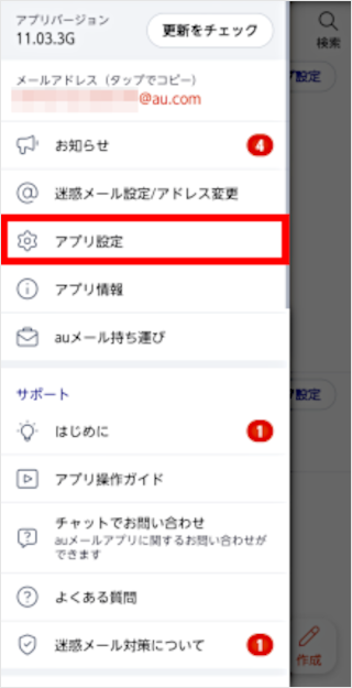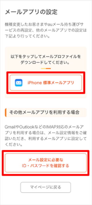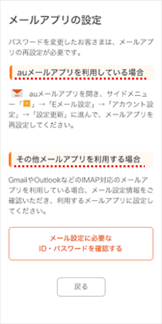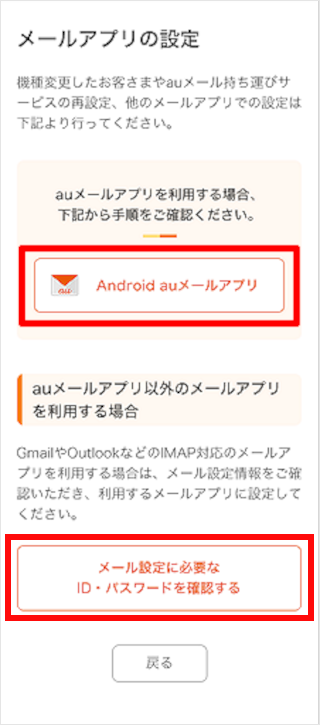 Android:[Android au メールアプリ]をタップします。 Gmail:[メール設定に必要なID・パスワードを確認する]をタップします。 ※ここでは「Android auメールアプリ」を選択した場合の手順をご案内します。