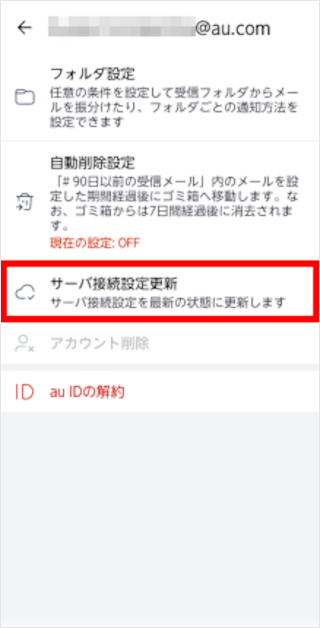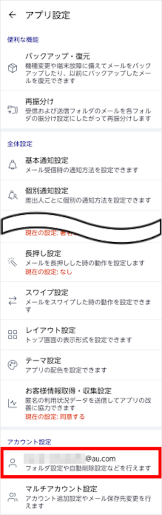 「アカウント設定」にある対象のメールアドレスをタップします。
