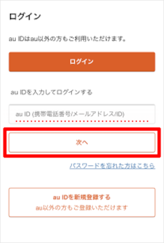 ご確認されたいメールアドレスの「au ID」を入力し、[次へ]をタップします。