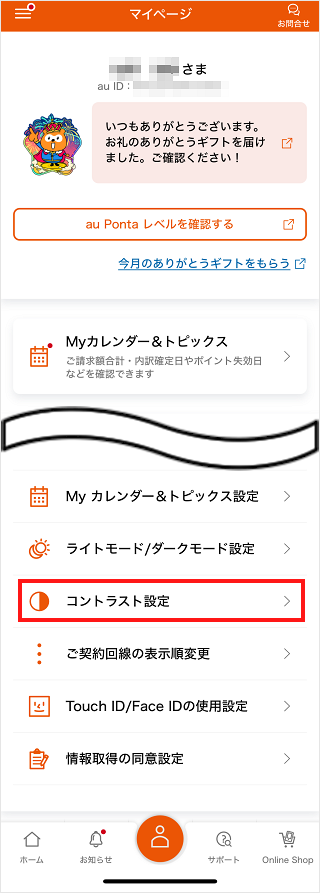 My au(アプリ)のコントラスト(明るさ)は、マイページで設定できます。