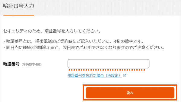 「暗証番号」を入力し[次へ]をクリックします。