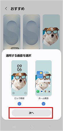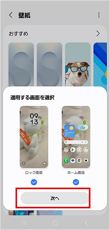 壁紙に設定する画面を選択し、[次へ]をタップします。 ※ここでは、「ロック画面」と「ホーム画面」を選択します。