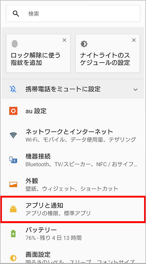 [アプリと通知]をタップします。 ※項目名は「アプリ」など、機種やOSバージョンによって異なります。