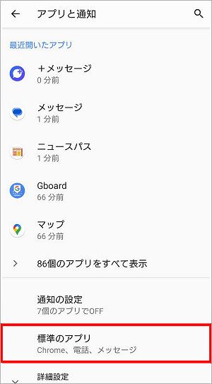 [標準のアプリ]をタップします。 ※項目名は「デフォルトのアプリ」「標準アプリを選択」など、機種やOSバージョンによって異なります。