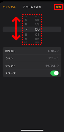 アラーム時刻を設定し、[保存]をタップします。