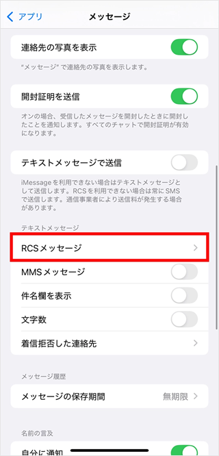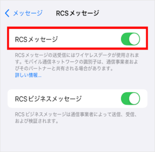 iPhoneでRCSをご利用いただくには「RCSメッセージ」オン設定が必要です。