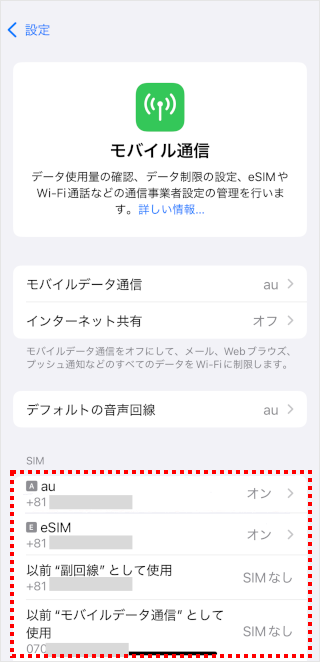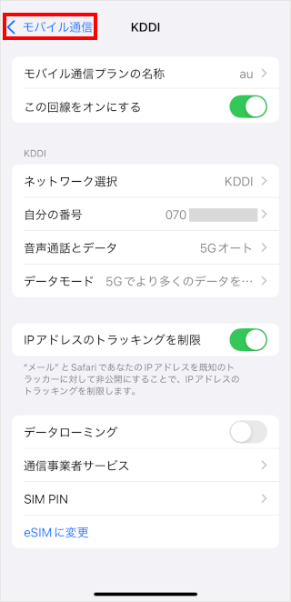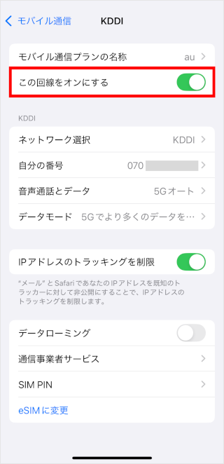 [この回線をオンにする]のスイッチをタップして、オフ/オンを切り替えます。