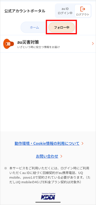 以下のリンク、またはQRコードから公式アカウントポータルにアクセスし、au IDでログインします。 公式アカウントポータルはこちら