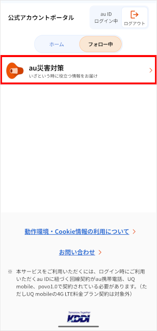 My au利用規約、My UQ mobile利用規約、ID利用規約、au Ponta ポイントプログラム規約およびアクセスデータの利用に同意の上、ログインしてください。