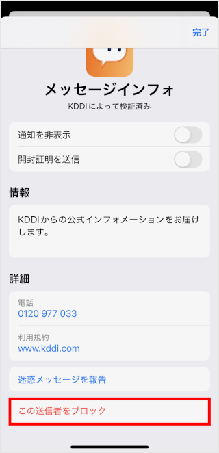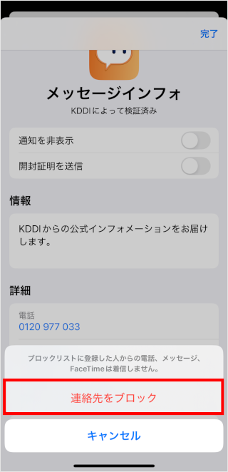 [連絡先をブロック]をタップすると、ブロックが完了します。 ※ブロック後も、公式アカウントポータル内の「フォロー中」のページではアカウントが表示されます。