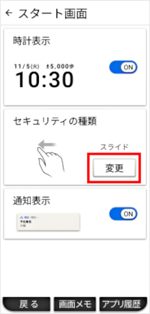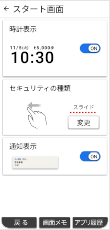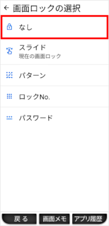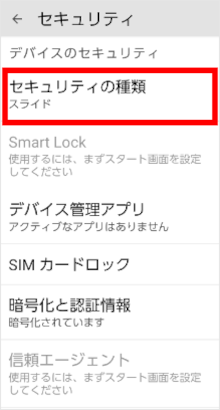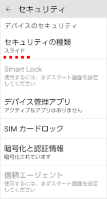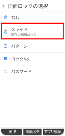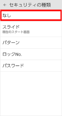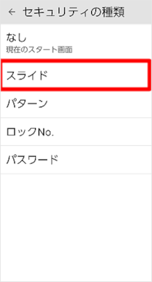 設定アプリの「セキュリティの種類」で画面ロックを「スライド」に設定することができます。