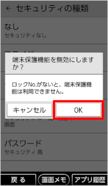 「パターン」「ロックNo.」「パスワード」を設定している場合は、端末保護機能無効についての確認画面が表示されますので、[OK]をタップします。