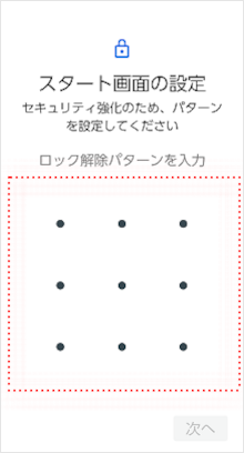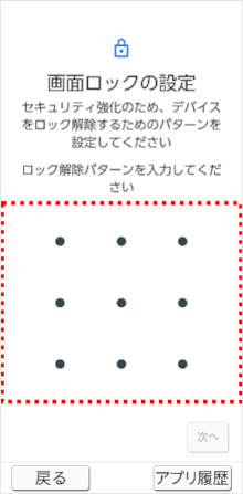 「ロック解除パターン」を入力します。 ※画面上に、4つ以上の点を結ぶ線を引きます。
