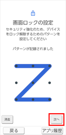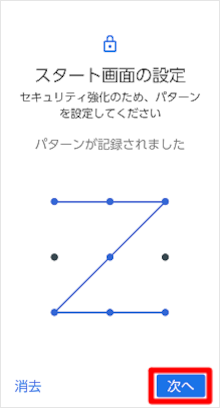 入力が完了すると、「パターンが記録されました」と表示されます。 [次へ]をタップします。