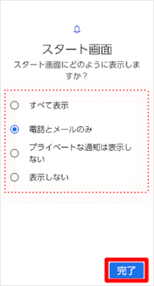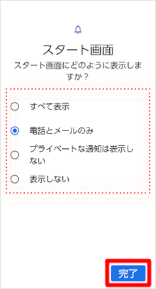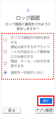 ロック画面上での「通知」の表示方法を選択し、[完了]をタップします。 ※「パターン」「パスワード」を設定している場合は表示されません。