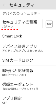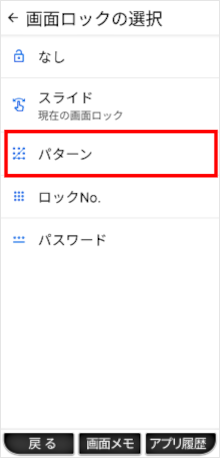 設定アプリの「セキュリティの種類」で画面ロックを「パターン」に設定することができます。