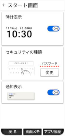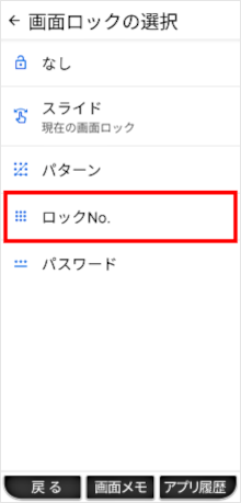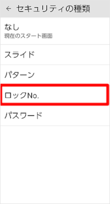 設定アプリの「セキュリティの種類」で画面ロックを「ロックNo.」に設定することができます。