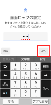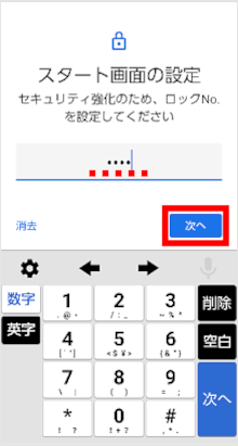 「ロックNo.」を入力し、[次へ]をタップします。 ※「ロックNo.」は4~16桁の数字を入力します。