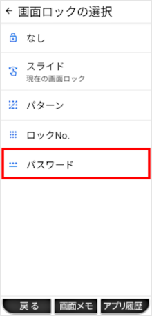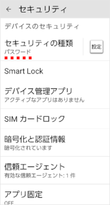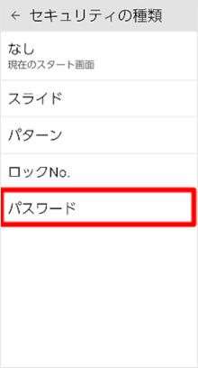 設定アプリの「セキュリティの種類」で画面ロックを「パスワード」に設定することができます。