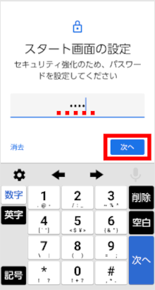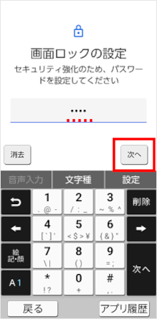 「パスワード」を入力し、[次へ]をタップします。 ※パスワードは4文字以上必要です。