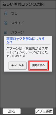 「パターン」「ロックNo.」「パスワード」を設定している場合は、端末保護機能無効についての確認画面が表示されますので、[無効にする]をタップします。