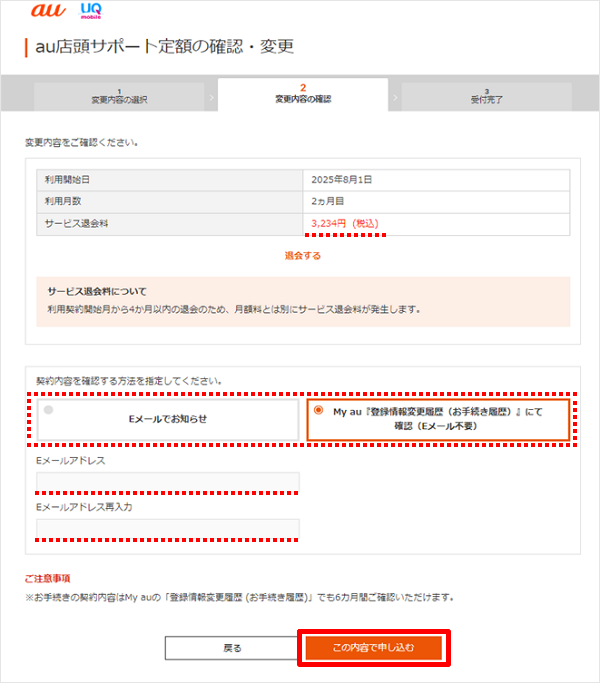 契約内容を確認する方法を選択し、[この内容で申し込む]をタップします。