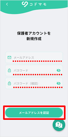 メールアドレス・パスワード(2か所)を入力し、[メールアドレスを認証]をタップします。